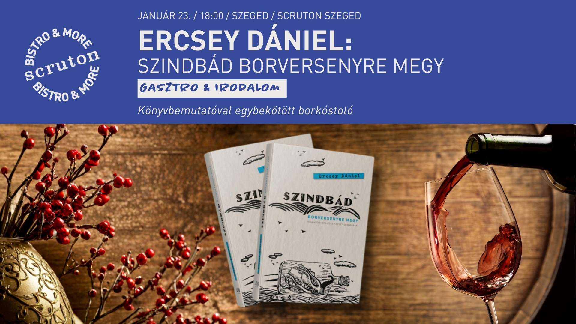 A könyvbemutatón Ercsey Dániellel beszélget Fejérvári Gergely borászati szakíró, az Ültess szőlőt! – Saját birtok! Saját bor! című kézikönyv szerzője, így az este nemcsak irodalmi, hanem borkultúrát érintő izgalmas párbeszéddé válik.
