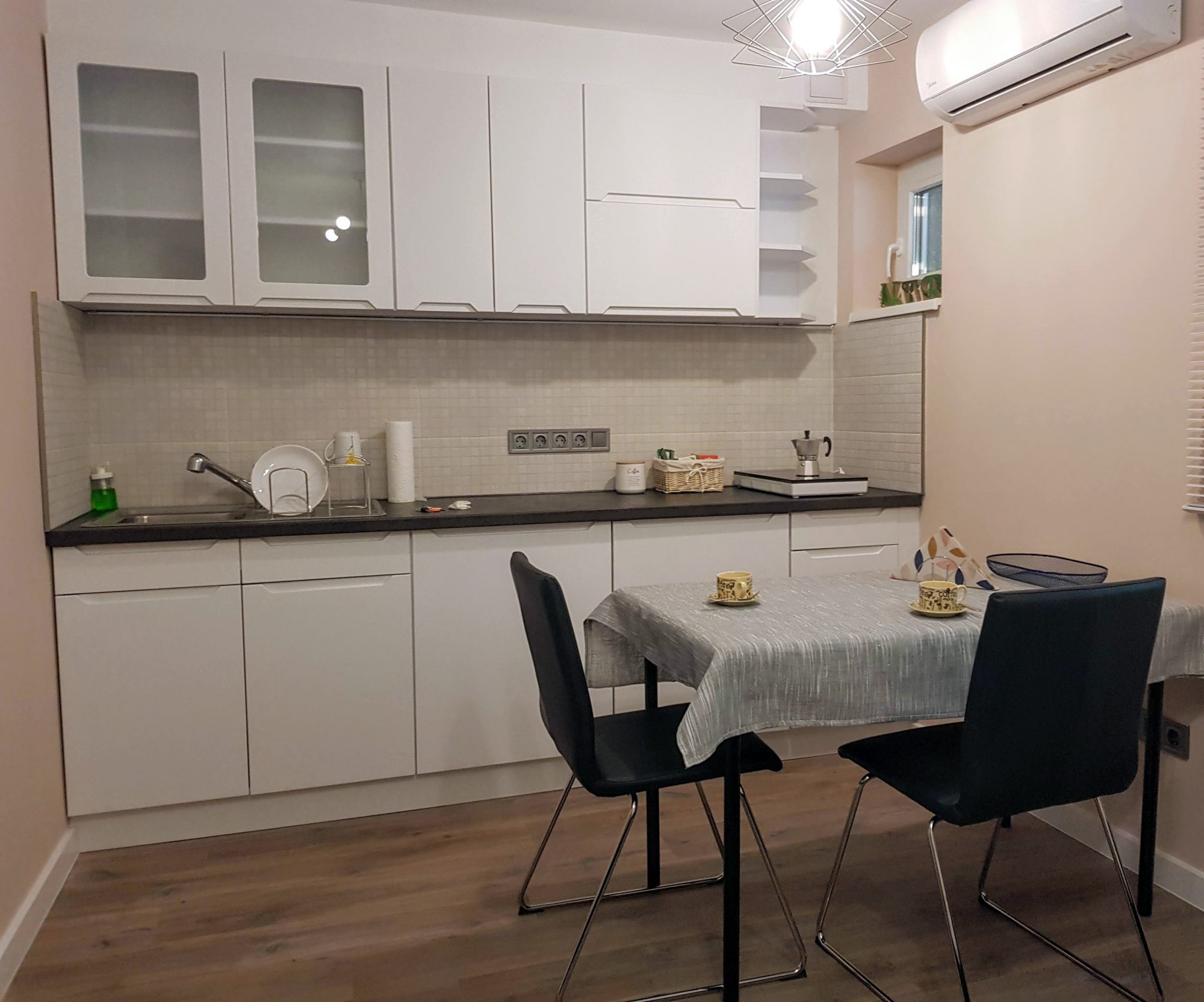 A 24 négyzetméter alapterületű, saját konyhával és fürdőszobával rendelkező klimatizált szállás 2 fő számára biztosít pihenési lehetőséget.